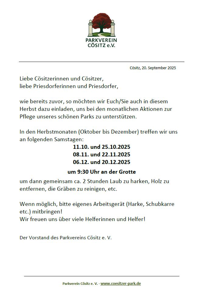 Der Parkverein hat sich zur Aufgabe gestellt, die nachhaltige Pflege des Cösitzer Parkes mit einer Fläche von 25 ha zu übernehmen in enger Kooperation mit der Stadt Zörbig und dem Ortsteil Cösitz.